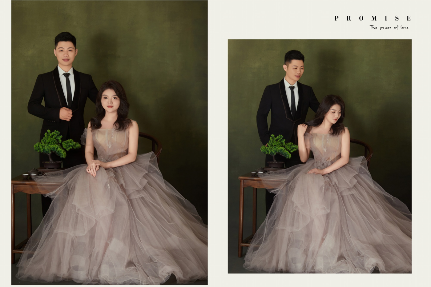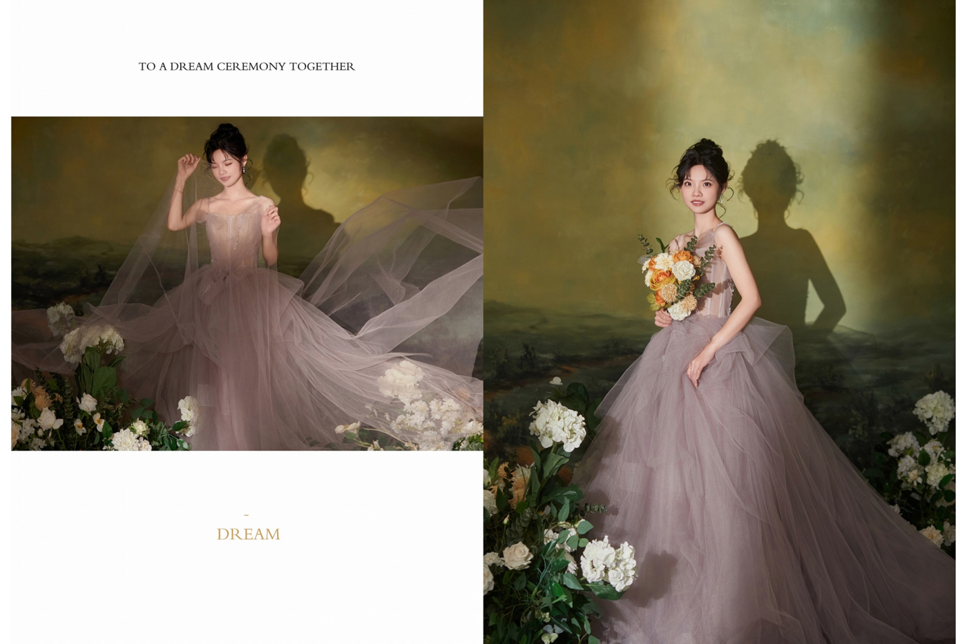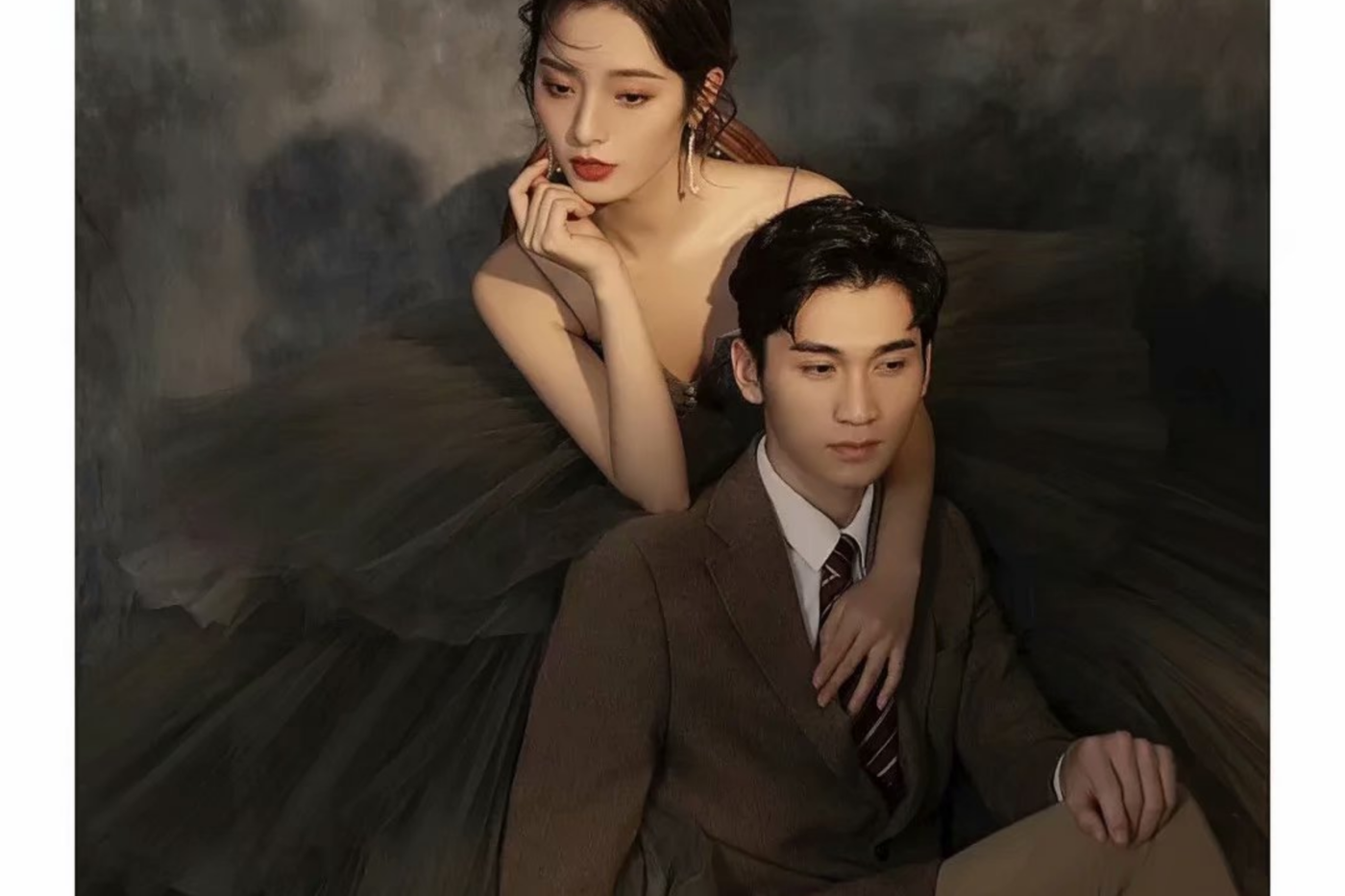 浅灰色的礼服和灰棕西装, 高级又不失稳重的油画背景, 记录下来的是光影氛围感的婚纱照。[更多…]