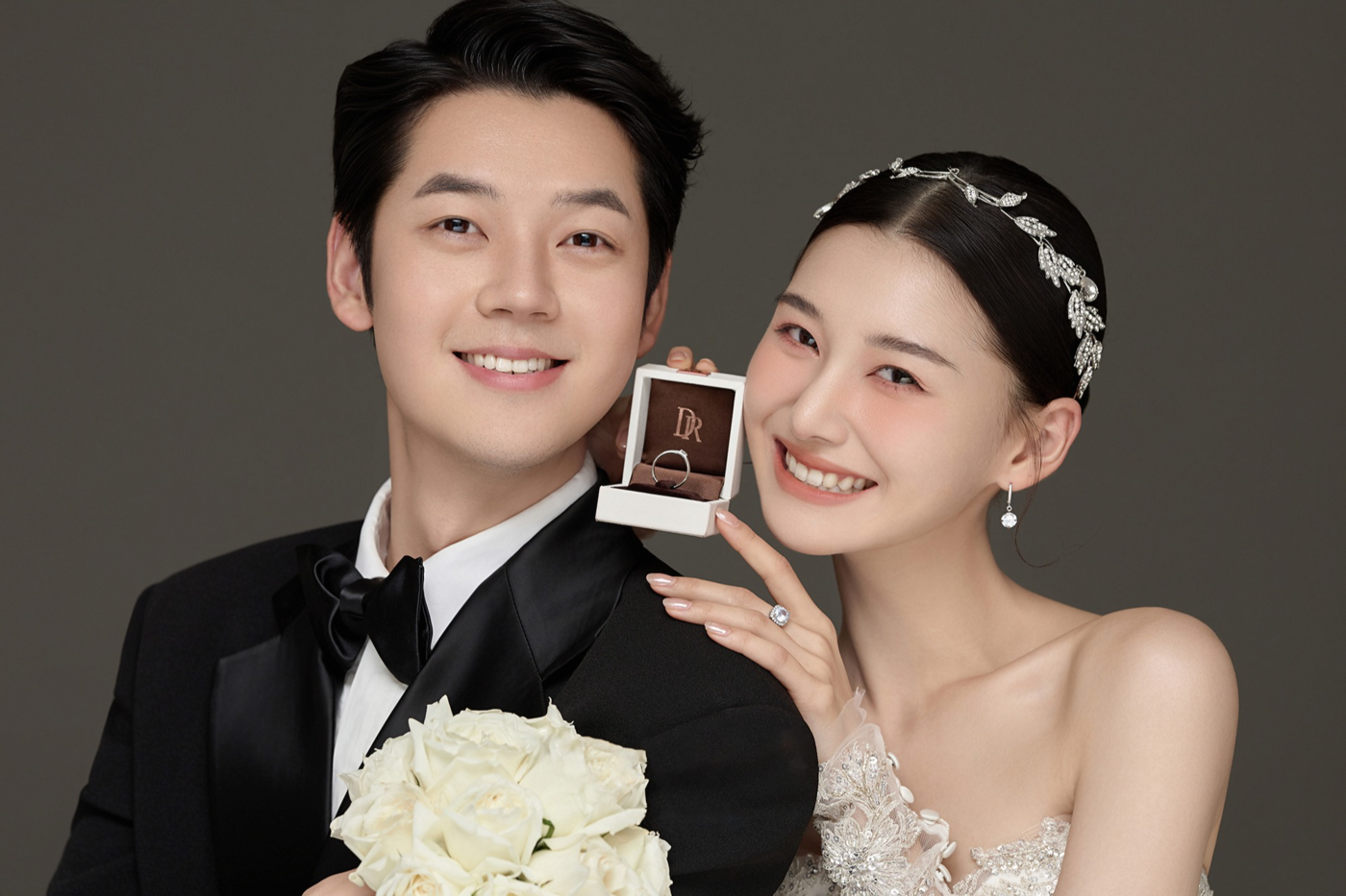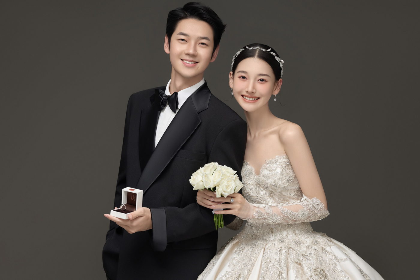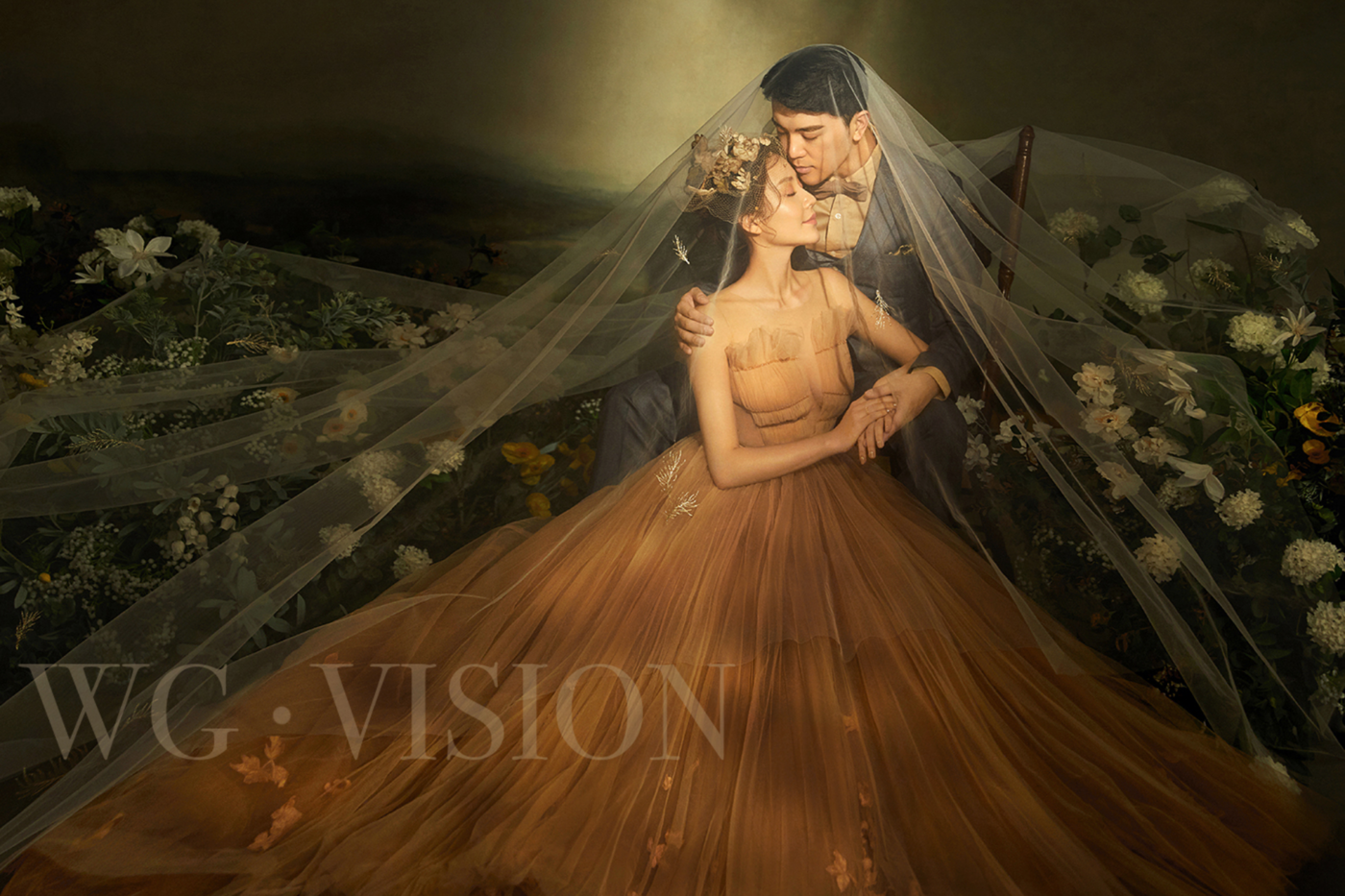 浅灰色的礼服和灰棕西装, 高级又不失稳重的油画背景, 记录下来的是光影氛围感的婚纱照。[更多…]