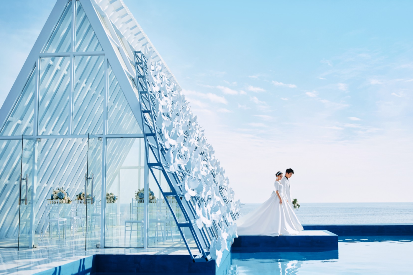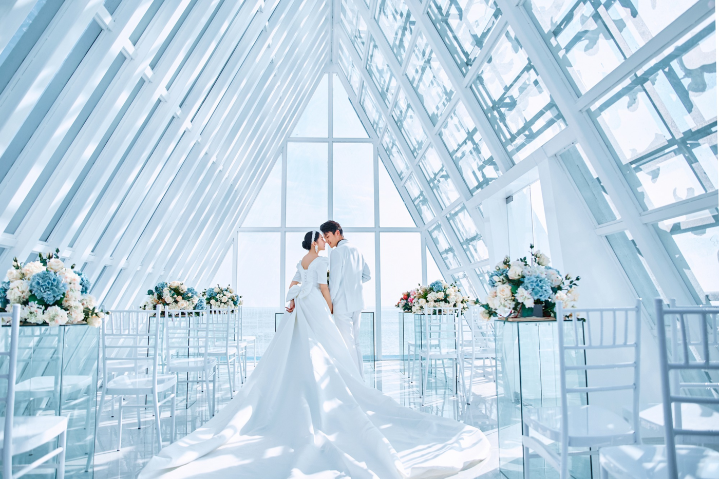 水晶玻璃教堂、白栏尖顶,与海景相辉映; 纯洁的白纱和阳光自由交织着,弥漫着浪漫圣洁的气息。[更多…]